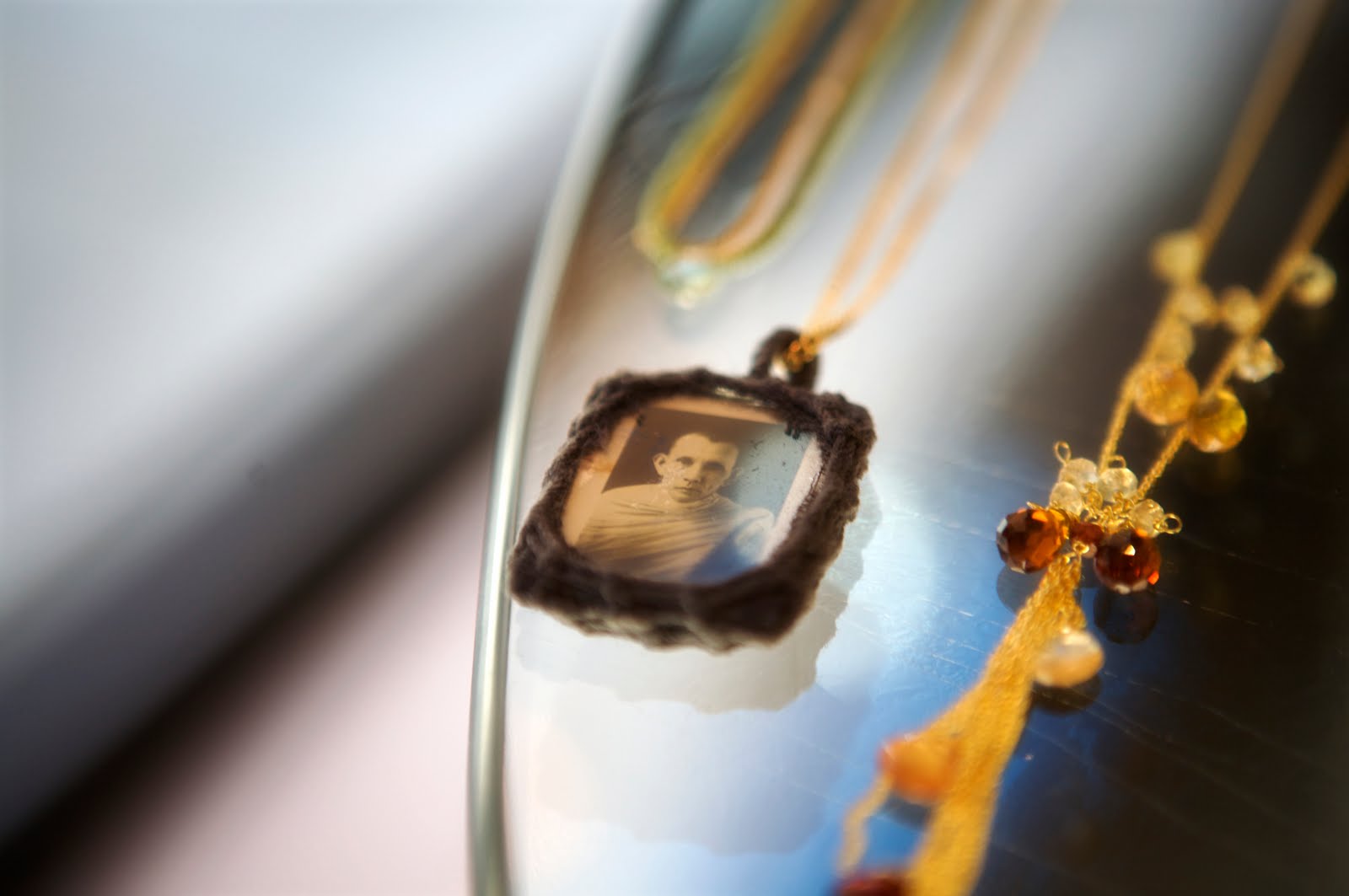 Necklaces from Zoe and Sage capture sepia toned snapshots under glass. Framed in what appears to be gnarled wood, but is actually linen cord manipulated into tortured shapes.