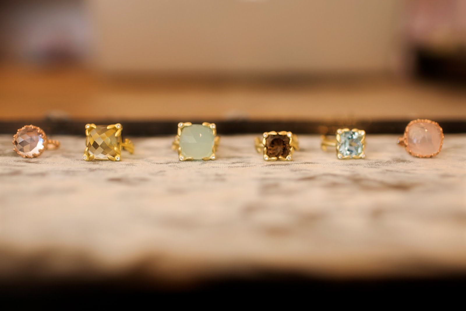Designer Grace Chen really knows what she is doing. Unusual settings, faceted semi-precious stones, and thickly plated green and rose gold.