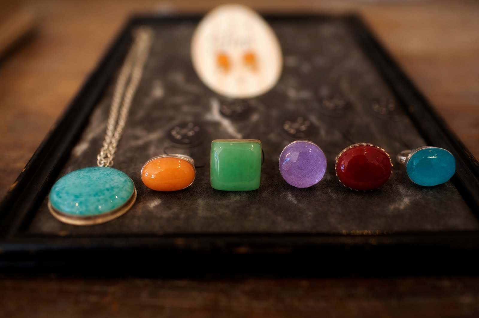 Designer Leilani Jensen Handcrafts each "stone" from solid, tempered glass, that is then lapidary cut. The result is a striking, completely handcrafted piece.