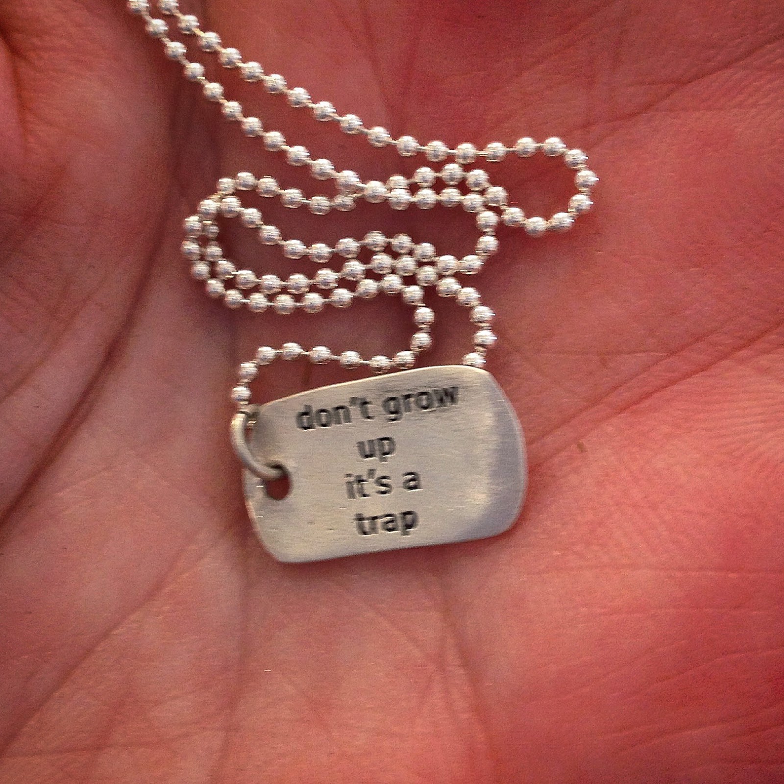 Don't do it. Posted by Fini Seattle · October 02, 2014 State your opinion on a tiny sterling dog tag. (That way, only the ones you let in really close will know.) Read more Tags: "don't grow up it's a trap" tiny sterling dog tags