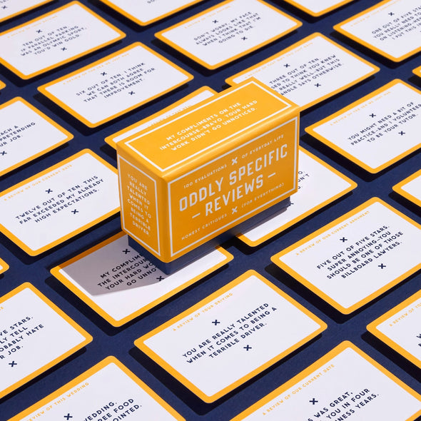 - Includes 100 double-sided cards–with each featuring a unique review on the front.