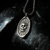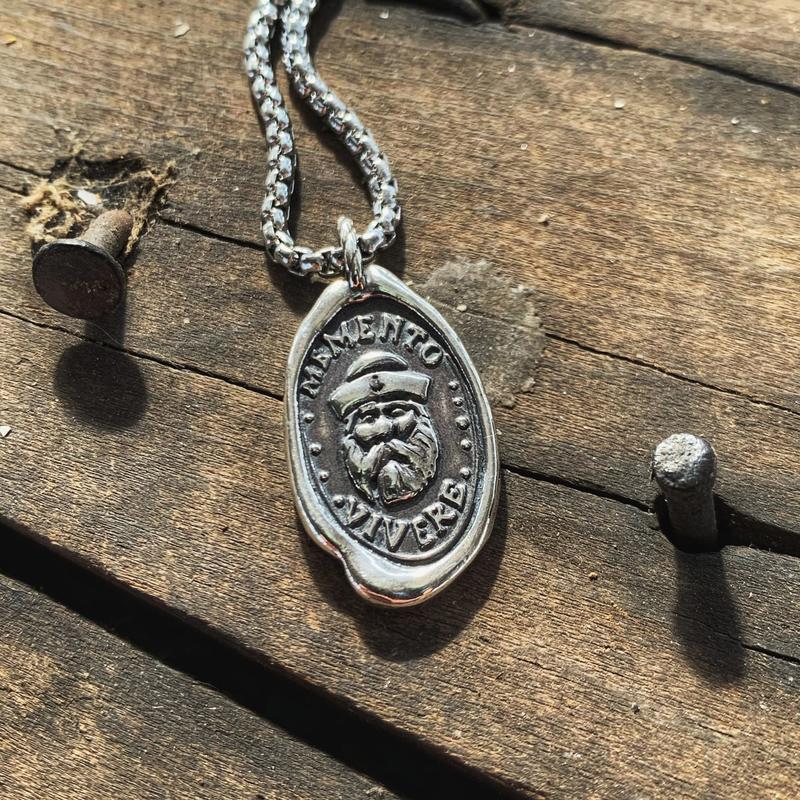 Hand-casted in the USA, this double sided wax seal pendant features the Latin words MEMENTO MORI with a skull on one side, and MEMENTO VIVERE with an old sailor’s face on the other.