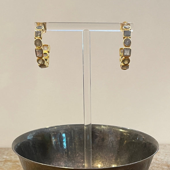Elevate any look with these stunning ten Stone Hoop Earrings. Crafted with semi-precious stones, they'll sparkle and shine, (just like you.)They're sure to make a beautiful statement no matter what the occasion. Earrings measure just over 3/4 of an inch across, and the stones are housed in gold vermeil.